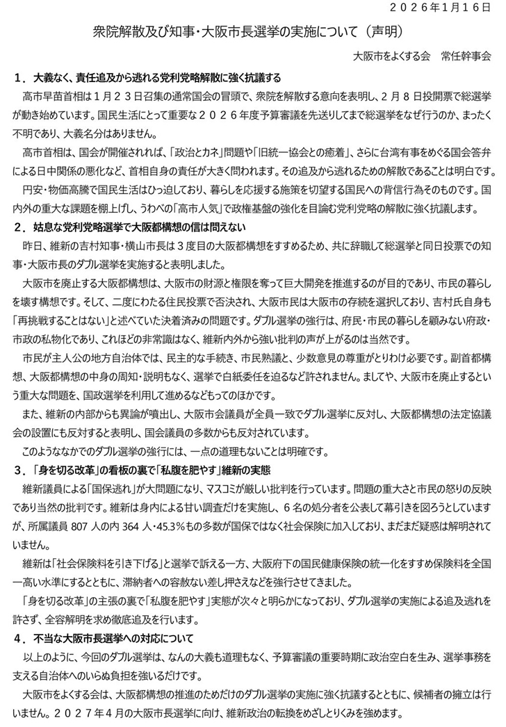 政権与党となった維新の会は、相次ぐ不祥事、藤田文武共同代表の「公金還流」問題で批判が高まり、とりわけ国民健康保険が全国一高い水準の大阪市民から怒りの声が上がっています。維新の吉村知事・横山市長は1月15日、3度目の大阪都構想をすすめるため、共に辞職して総選挙と同日投票での知事・大阪市長のダブル選挙を実施すると表明しました。「ダブル選挙の強行は、府民・市民の暮らしを顧みない府政・市政の私物化であり、これほどの非常識はなく、維新内外から強い批判の声が上がるのは当然です。」(大阪市をよくする会声明、裏面参照)維新政治の転換をめざしとりくみを強めます。