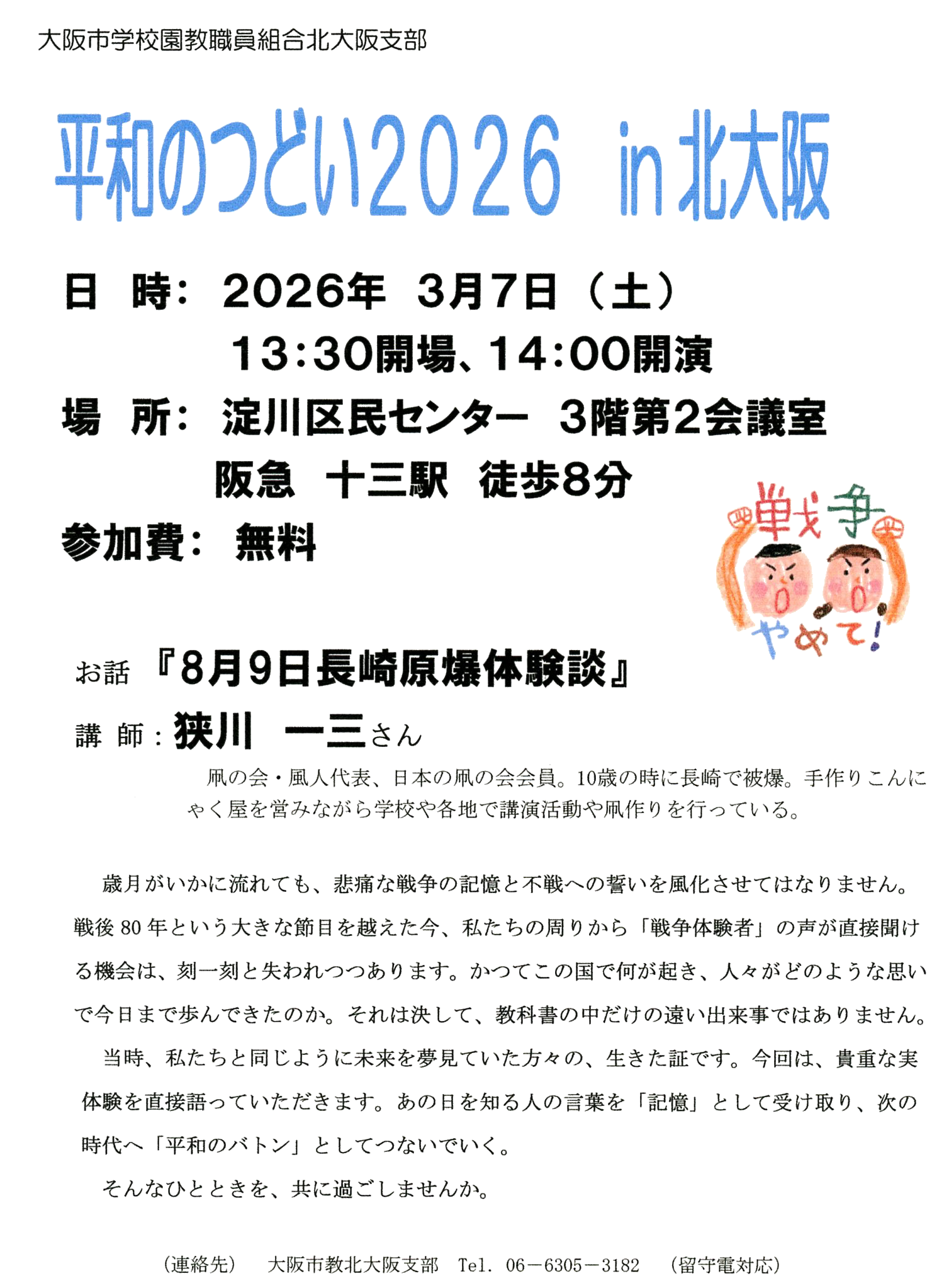 平和のつどい2026 in北大阪 2026年3月7日(土)13:30会場 14:00開演 淀川区民センター 「8月9日長崎原爆体験談」 狭川一三さん